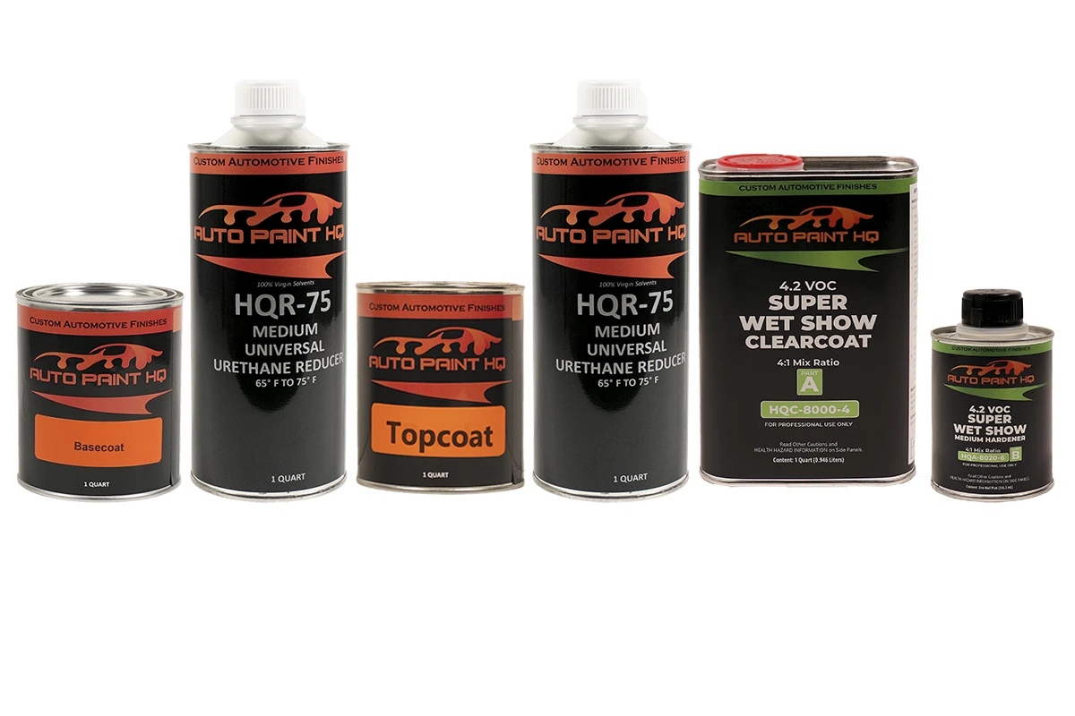 The Cool Mint Base Color mixes 1:1 with the reducer making 2 Quarts of sprayable Base. The Mother of a Pearl Color mixes 1:1 with the reducer making 2 Quarts of sprayable Pearl. The 4:1 mix ratio Super Wet Show Clear Kit makes 1-1/4 quarts of sprayable Clear.